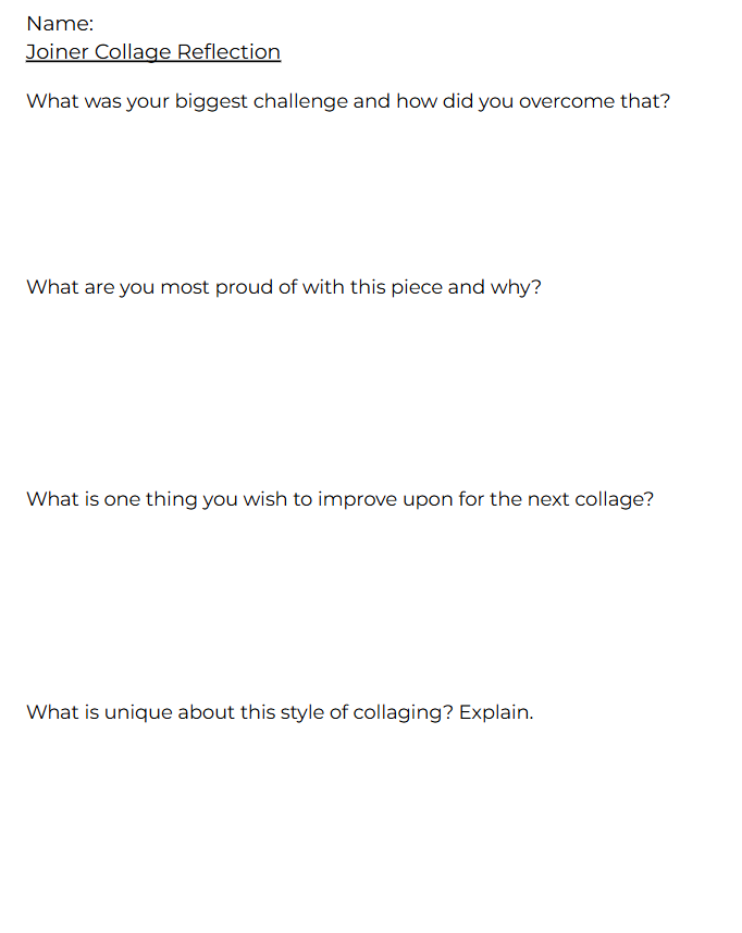 As a class we will discuss their final joiner collages. We will examine how each person made a unique collage with a unique perspective. Students will say one part of the lesson they found difficult. This will help build classroom connections as many of them will have similar answers.
