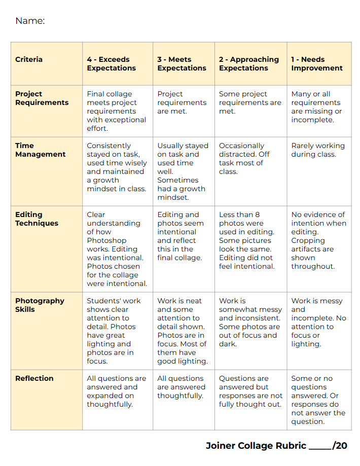 During work time I will monitor students progress. Each day I will have an exit ticket for students to ensure they understood the lesson. Students will be graded on the following rubric that includes a reflection.